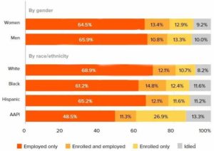 从上图可以看出,除了亚裔/太平洋岛民之外,其他主要族裔的大学生毕业后都主要选择直接就业,其中白人大学毕业生达到近七成(68.9%)。