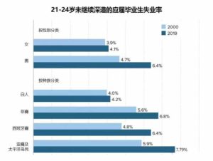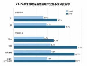 从上面的图表可以看出,从2000年到2019年,所有其他种族的失业率都大幅度上升了,而白人的失业率上升幅度却很小。如果再看看不充分就业率的话,这个差别就更加明显了。报告指出,白人应届毕业生不充分就业率约为8.9%,西班牙裔为13.5%,亚裔及太平洋岛民为13.6%,非裔则高达14.1%。