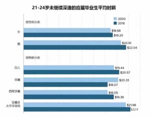 而在工资差异方面,白人大学毕业生却并不占优势。亚裔及太平洋岛民在平均工资方面一直都领先于其他所有种族。2019年,亚裔及太平洋岛民毕业生平均时薪为$22.97,这个数字在2000年则为$21.98。非裔毕业生在2000年时是平均时薪第二高的种族,平均时薪为$20.33,但到了2019年时却大幅度下降到了$18.07,比所有其他种族都要低,差不多降到了2000年西班牙裔的平均时薪水平$18.05,当时西班牙裔是所有种族中平均时薪最低的。到了2019年,西班牙裔毕业生的平均时薪上涨了$1.34,是所有种族中薪水涨幅最大的,也是唯一一个时薪涨幅超过一美元的种族。