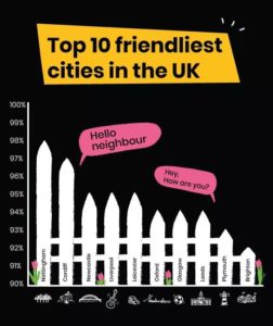 近日,英国知名运营商GiffGaff做了一份英国城市友好度调查,这份调查主要通过“社区关系”来反映一座城市的友好程度。